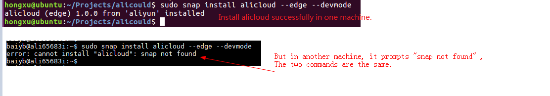 I find that only my machine which snapcraft build the alicloud snap can install it successfully.
