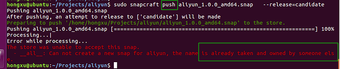 I want to register the snap name “aliyun” in the Store , but failed. Who registered it ? If it’s me , I can push the snap successfully , is that right ?