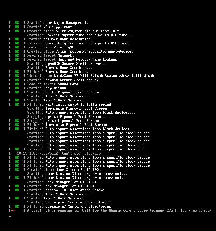 It stops at the log states that: A start job is running for the Ubuntu Core chooser trigger (–mins --s/no limit)