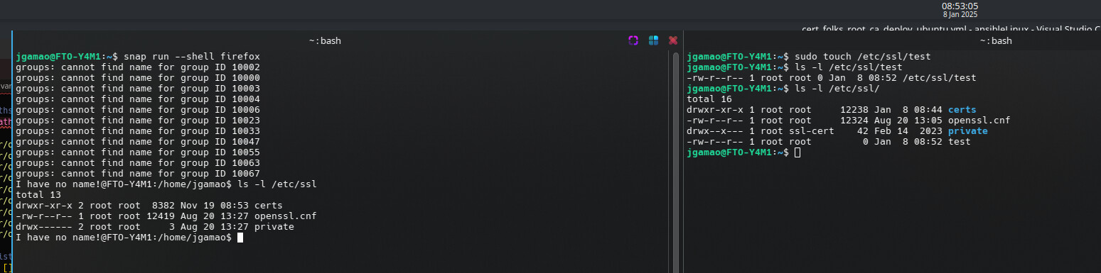 Well, that looks okayish too … so it likely boils down to the AD accounts, not sure how they could influence the namespace mounting though, you should open a new post in the snapd category specifically for this issue (IIRC there is more than /etc/ssl that gets mounted from the host so you might have other unnoticed issues too if that whole feature doesn’t work)