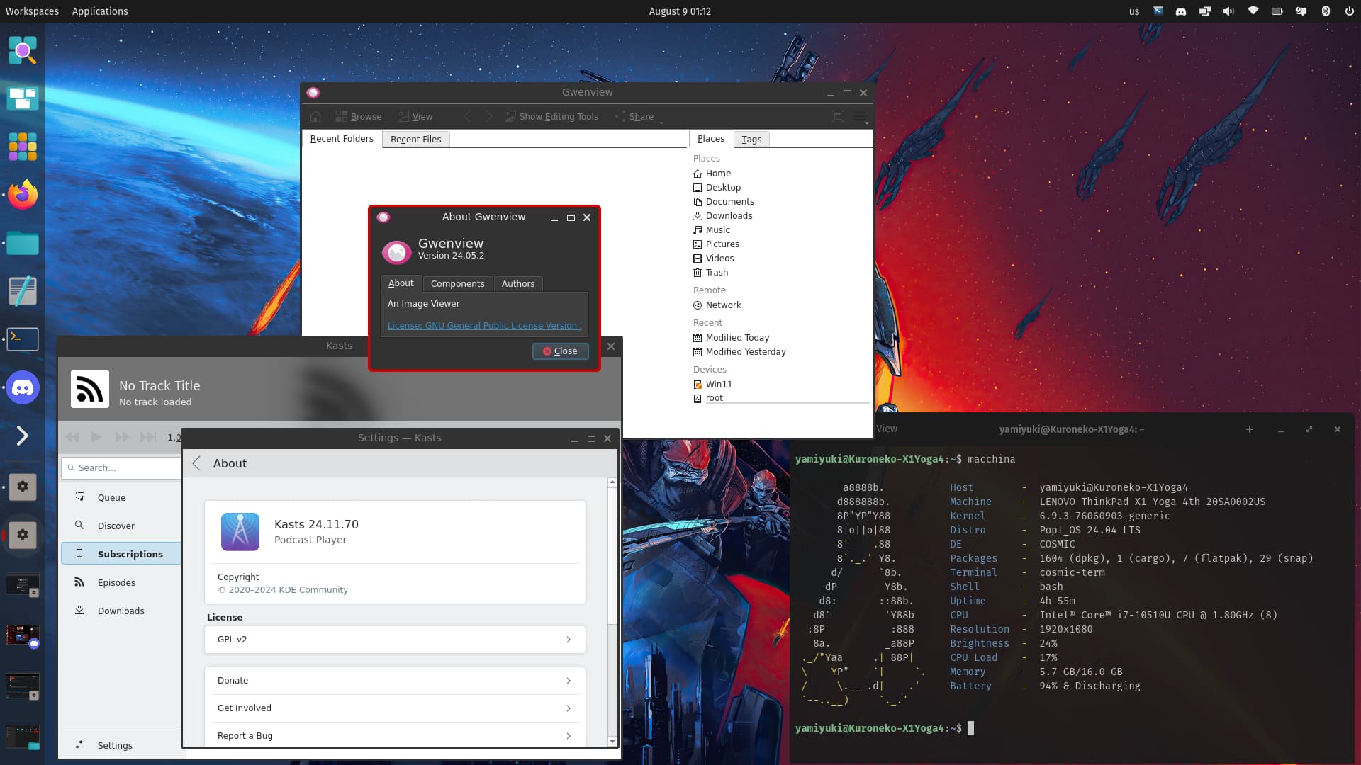 This is Gwenview and Kasts on Pop!_OS 24.04 alpha with Cosmic DE, and…I don’t even know what theme Gwenview is using. At least Kasts looks fairly decent.