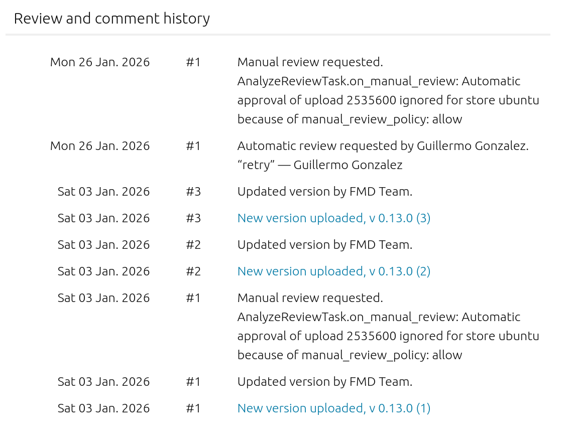 Like some others ([1], [2]), the new snap for FMD Server (fmd-server) that we (the FMD maintainers, Nulide and I) submitted on 2026-01-03 is still stuck in “Manual Review”. That’s 3 weeks ago.
