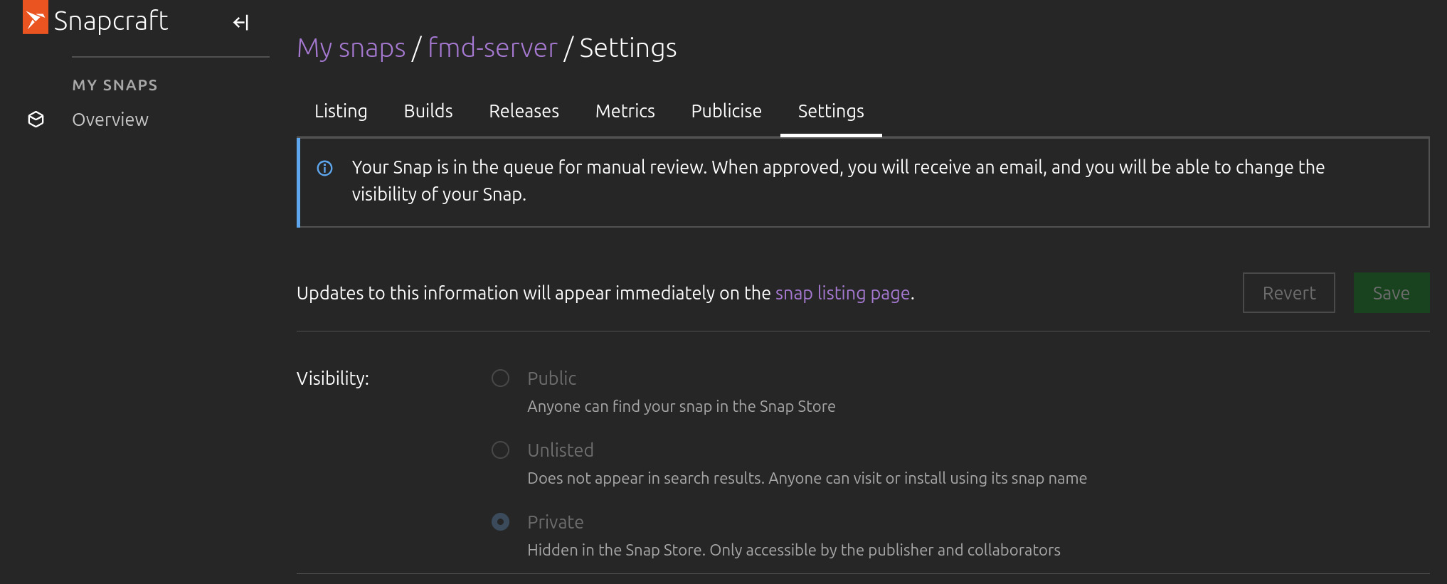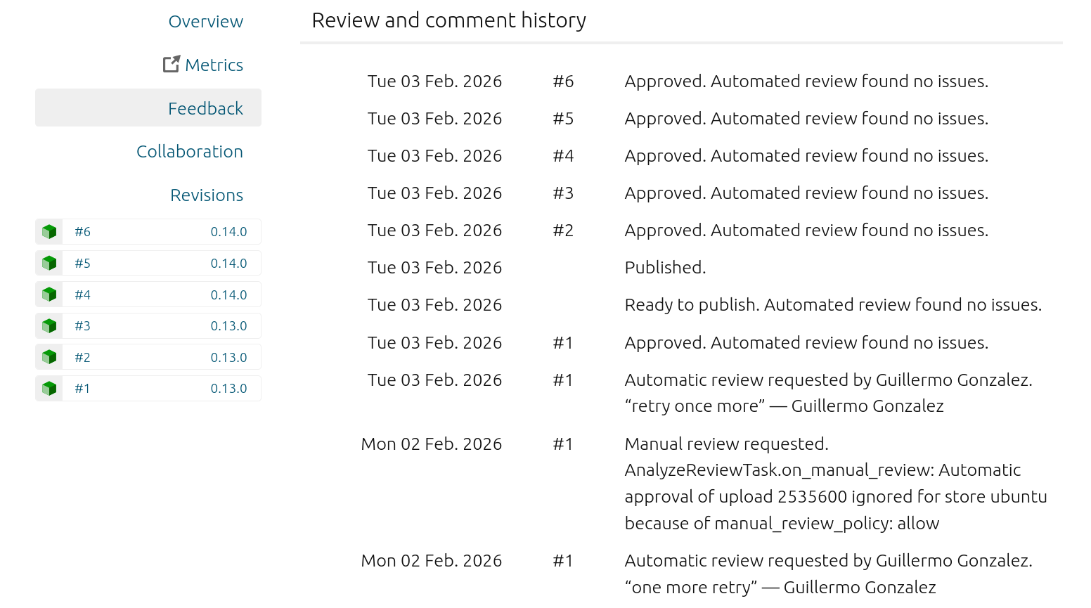 Also, there are 3 “revisions” so far. I guess that’s because we uploaded a single version (0.13.0) three times (amd64, arm64, armhf), and that shows up as separate “revisions”?