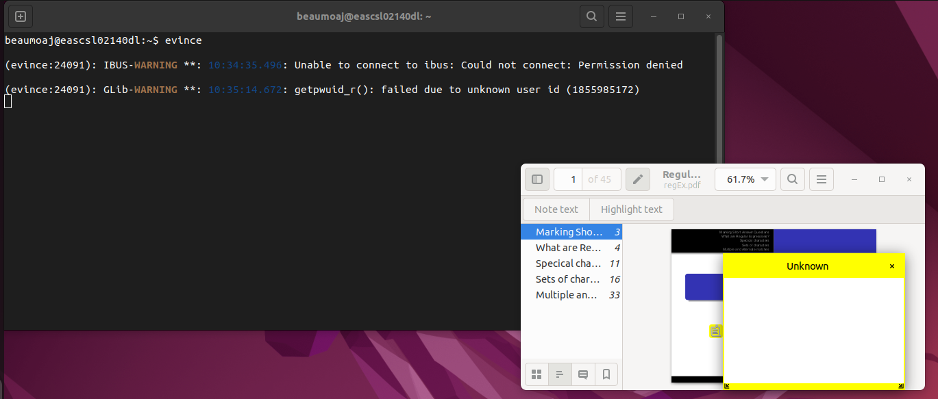 (evince:24091): GLib-WARNING **: 10:35:14.672: getpwuid_r(): failed due to unknown user id (1855985172)