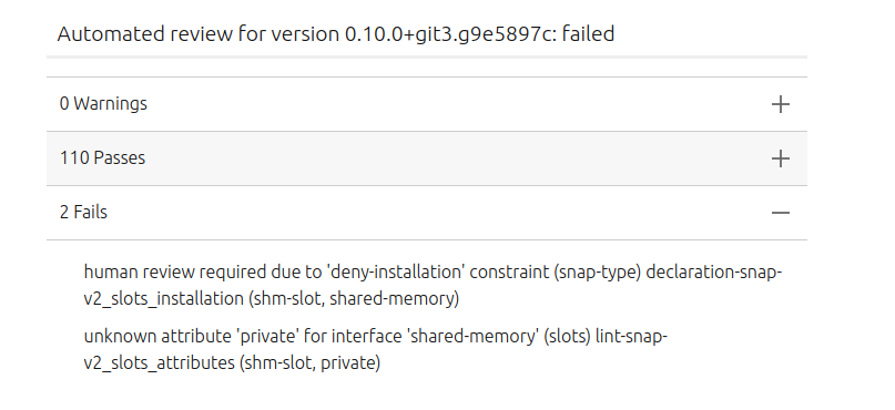 I can see the Fail message: “human review required due to ‘allow-installation’ constraint (bool) declaration-snap-v2_plugs_installation (shm-plug, system-files)”. Please let us use this interface and if possible allow auto-connection.