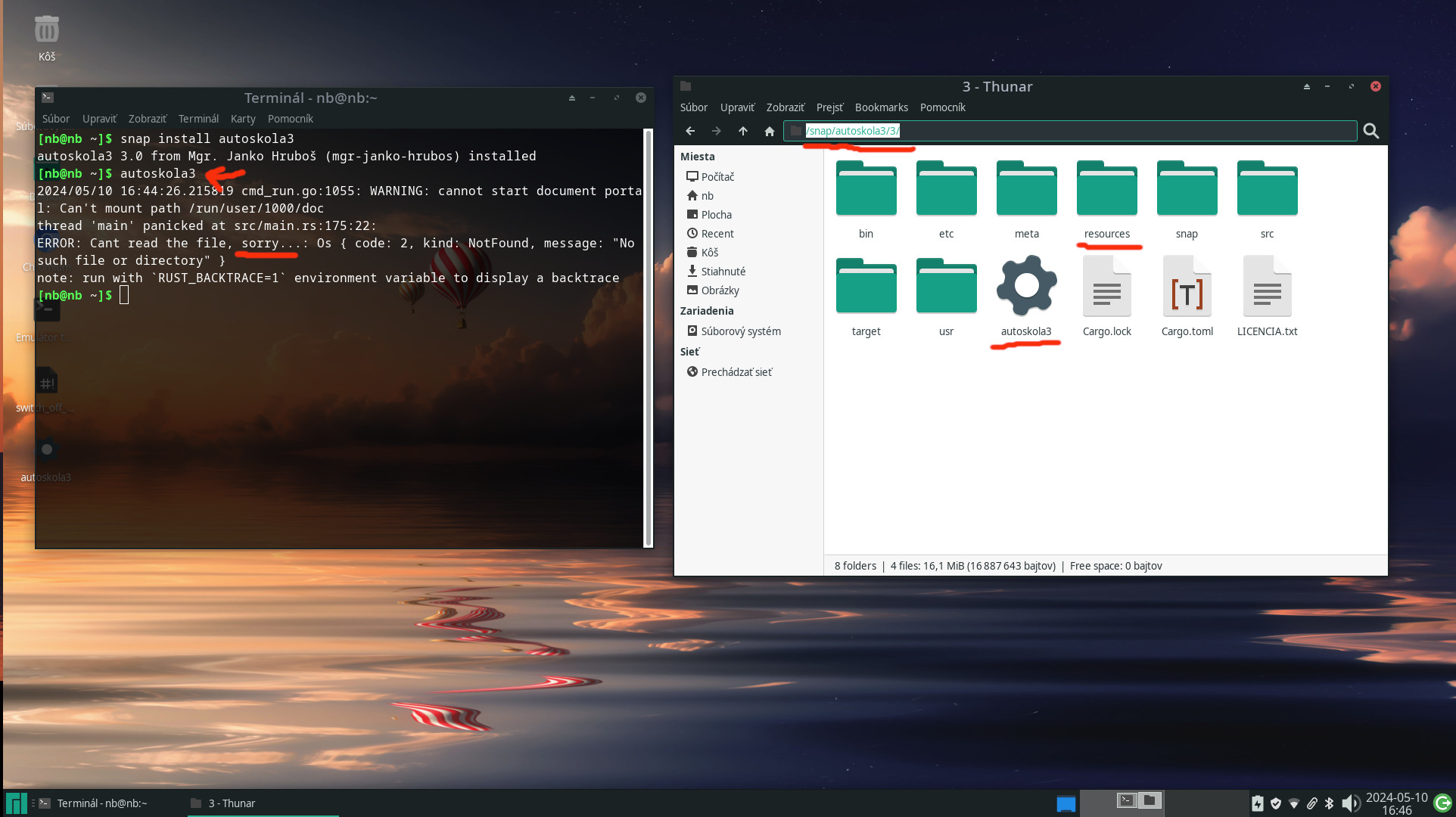 All right I created revision3 with staged resources. Seems to be error of Linux. The only way how to run the app is to open folder program /snap/autoskola3/3/autoskola3 manually. Otherwise the program crashes. Resources are present in this folder with program. Some pictures of the situation: