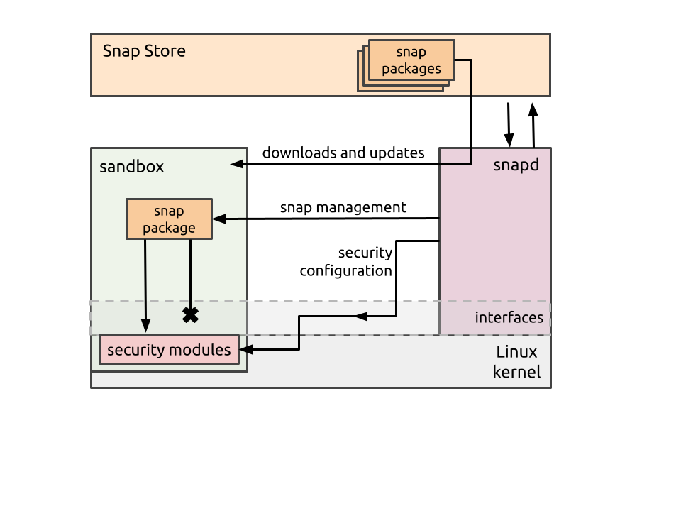 The snap daemon uses privilege isolation mechanisms rooted in the Linux kernel through Cgroups and Namespaces, AppArmor and Seccomp.