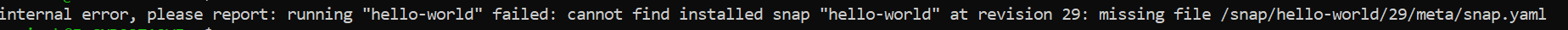 internal error, please report: running “hello-world” failed: cannot find installed snap “hello-world” at revision 29: missing file /snap/hello-world/29/meta/snap.yaml
