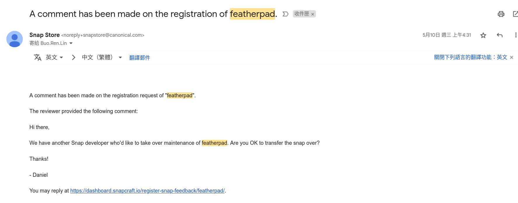 Although I’m thrilled to have someone willing to devote their precious resources to address the burden of the Featherpad snap’s maintenance, I also, have the responsibility to ensure that the snap doesn’t fall into the wrong hands(I already have a bad reputation for “snap maintenance negligence”, I wouldn’t want to gain another one which is “snap ownership transfer negligence”, right?). As a result, I would like to request to temporarily suspend this ownership transfer process and focus on addressing the problems that cause the necessity for the snap ownership transfer in the first place.