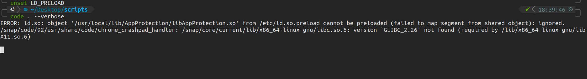 /snap/code/92/usr/share/code/chrome_crashpad_handler: /snap/core/current/lib/x86_64-linux-gnu/libc.so.6: version `GLIBC_2.26’ not found (required by /lib/x86_64-linux-gnu/libX11.so.6)